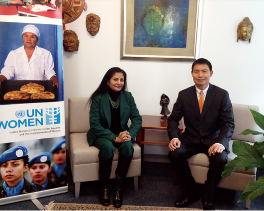 此外,,,,纽约时间3月5日上午,,,,联合国总部官员还在会前特邀方玉友先生,,,共同探讨企业如何以创新思维帮助女性迎接职场挑战。。。妇女署执行副主任Lakshmi Puri女士热情地为方玉友先生介绍了诸多解决女性就业挑战的国际潮流思路。。。。